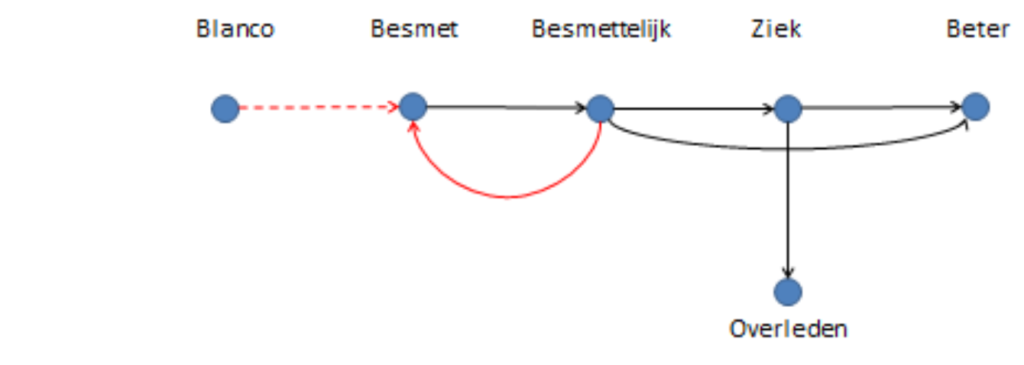 Om het allemaal iets concreter te maken, heb ik het idee verkend met behulp van een eenvoudig pandemie model in Excel, met geheugenloze overgangsfracties. De toestanden zijn Blanco (=besmetbaar), Besmet (maar nog niet Besmettelijk), Besmettelijk, Ziek (en geïsoleerd daarom), Beter (en immuun) en Overleden. Zie Figuur 1.